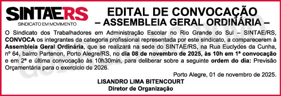 Home > O Sindicato > Notícias > Sem categoria > Sintae/RS convoca para Assembleia Geral no dia 08 de novembro