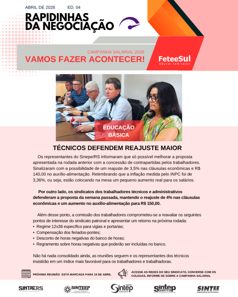 Home > O Sindicato > Notícias > Sem categoria > Educação Básica: técnicos defendem reajuste maior