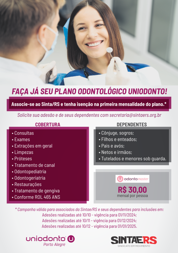 A Secretaria do SINTAE/RS informa aos associados que alterações, inclusão e cancelamento do Plano Dental – Uniodonto – oferecido pelo Sindicato, podem ser feitas a partir do dia 1º ao dia 10 de cada mês.